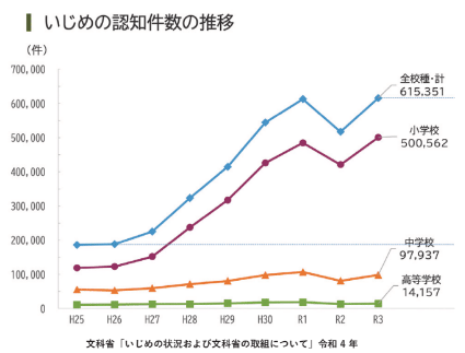 文部科学省は、令和4年、「いじめの状況および文部科学省の取組について」の調査結果を公開した。いじめの認知件数は、615,351件(前年度 517,63件)であり、前年度に比べ98,188件(19・0%)増加と、前年度より9万 8,188件(19・0%)増加し、過去最高となった。