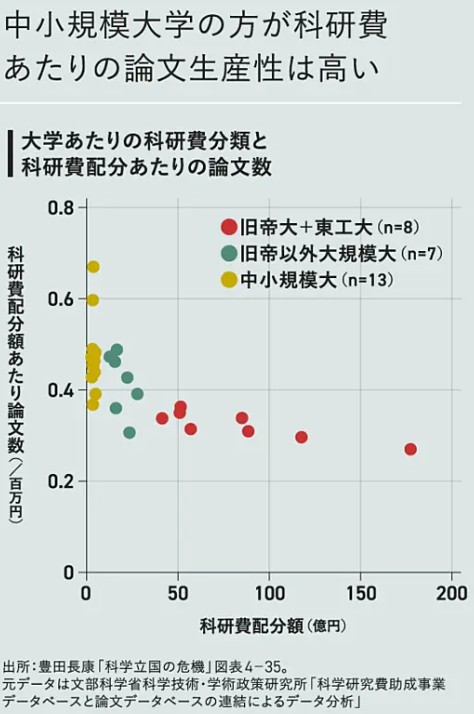 また、科研費の配分は旧帝国大学や東京工業大学(現、東京科学大学)などの大規模大学に偏る傾向があります。科学ジャーナリストの須田氏による2020年の記事によれば、資金100万円あたりの論文生産性では中小規模大学の方が高い成果を上げており、高注目論文の数においても大規模大学と大きな差はないとされています。これは、研究の生産性において大規模大学が必ずしも優位ではないことを示唆しており、「大規模大学の研究力は高い」という従来の前提が揺らいでいることを意味します。にもかかわらず、科研費の配分は見直されておらず、こうした実態を反映しないままとなっています。